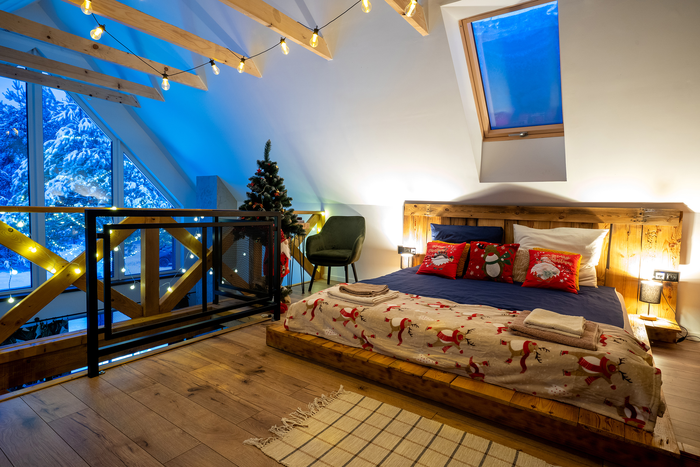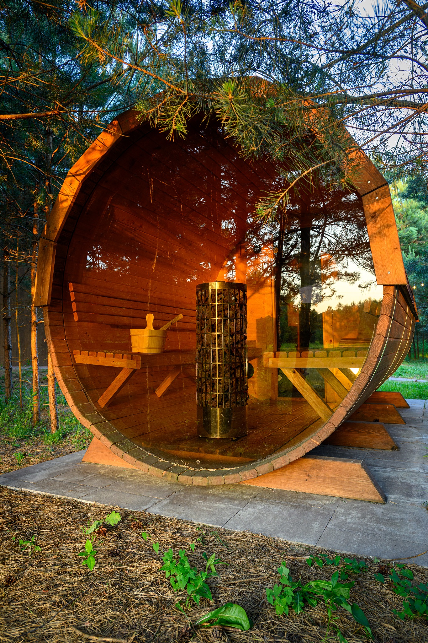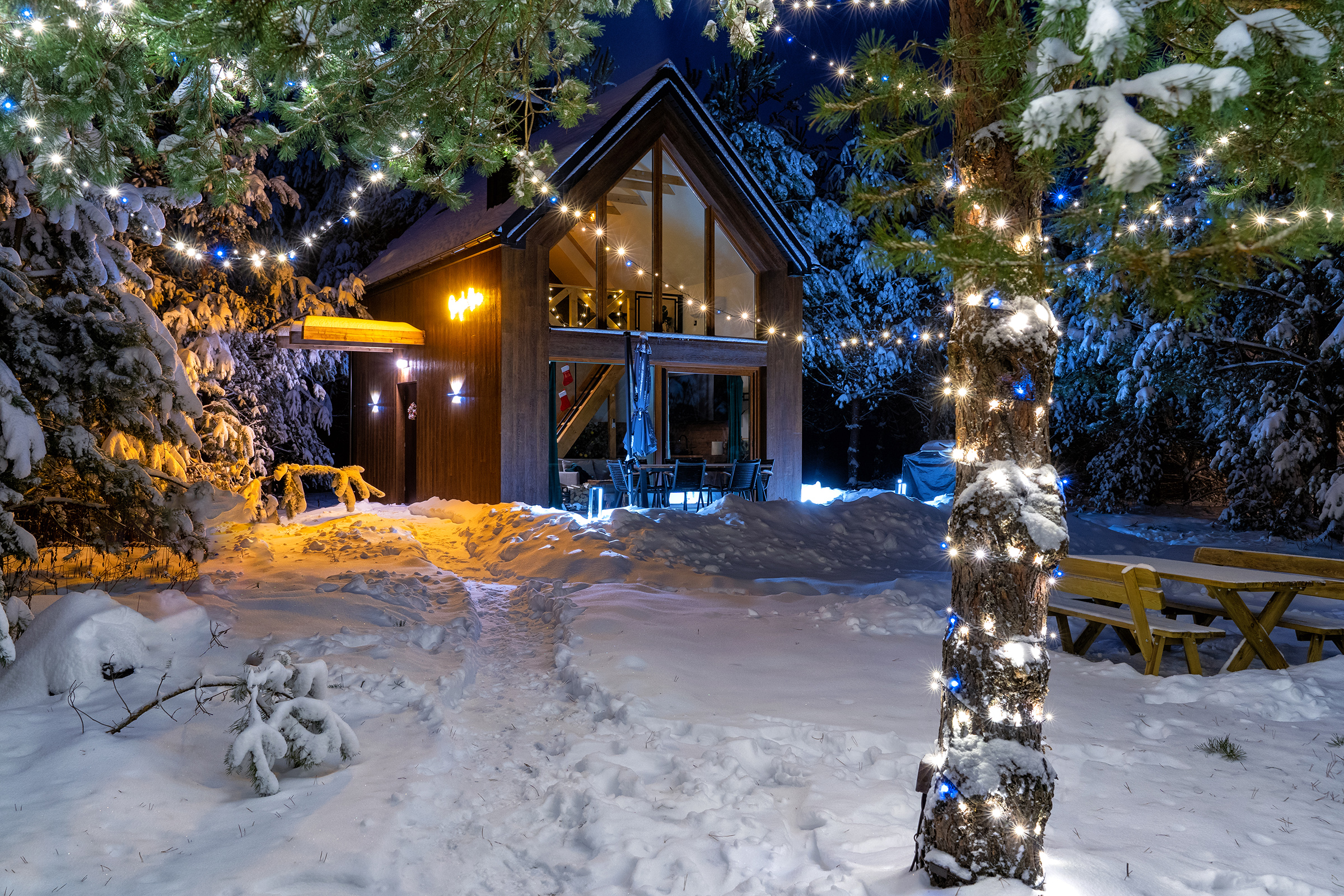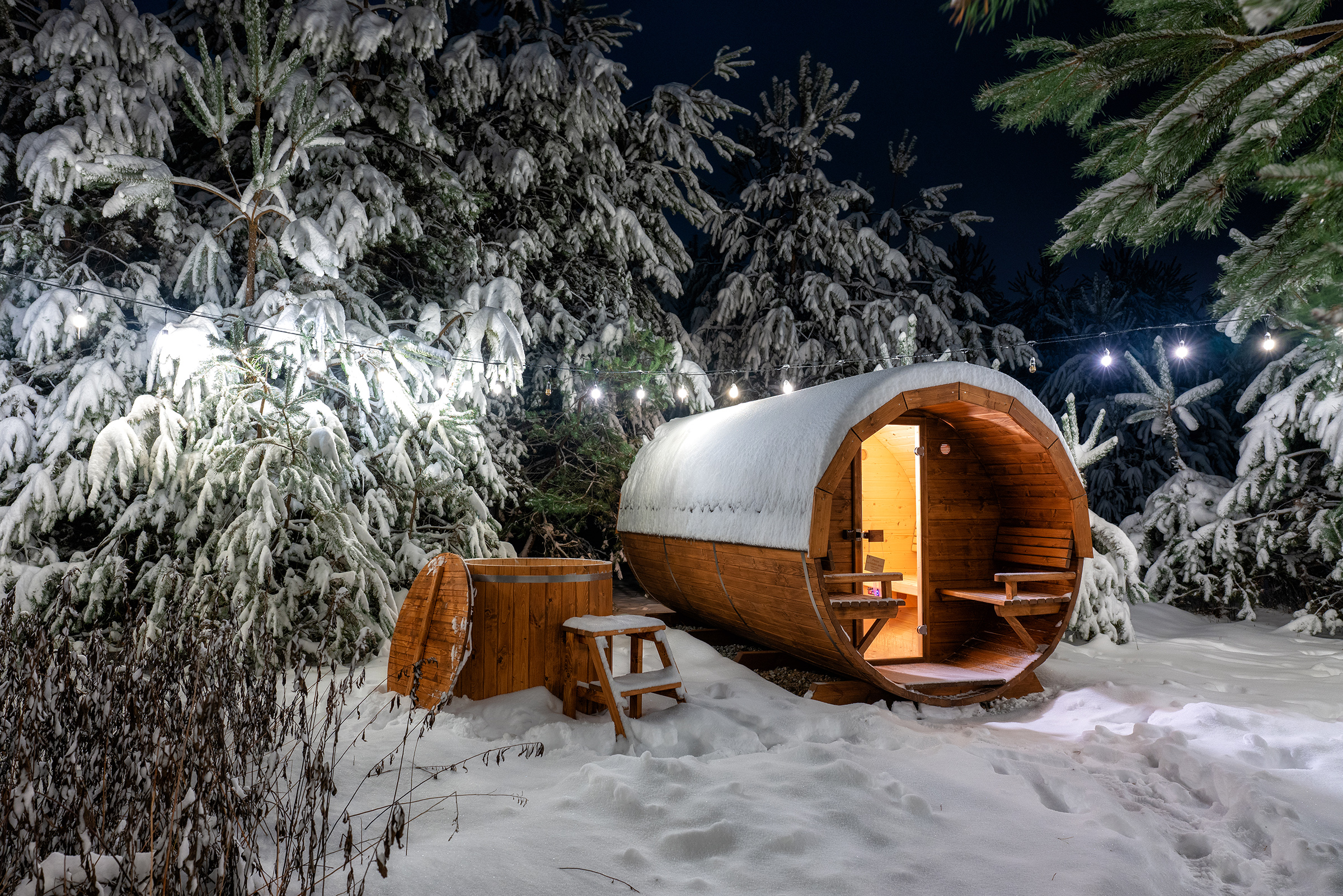 - Panoramiczna przyciemnianą szyba sprawia, że korzystając z sauny masz przepiękny widok lasu, dodatkowo teren gdzie znajduje się sauna jest przepięknie oświetlony girlandami przez co jest bardzo przytulnie.