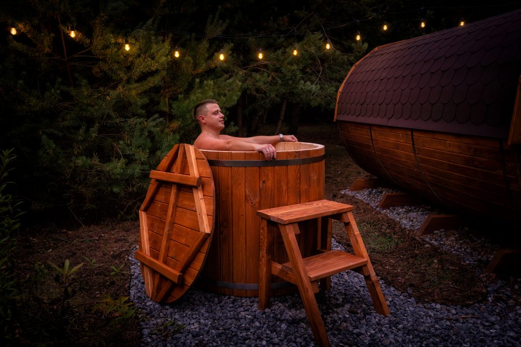 - Przed sauną znajduje się beczka z zimną wodą do szybkiego schładzania ciała. Zabieg bardzo prozdrowotny – zamyka otwarte pory na cieple przez co bardzo hartuje nasz organizm.