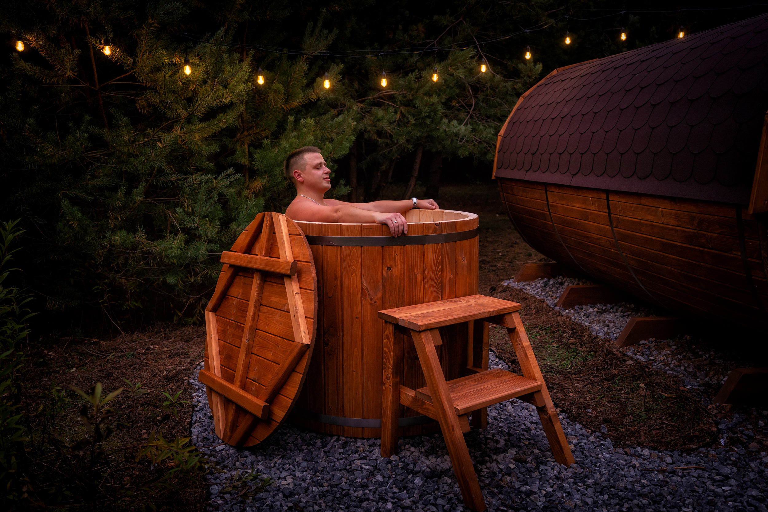 To tutaj odnajdziesz spokój i harmonię – możesz włączyć swoją ulubioną muzykę, sięgnąć po aromaty różane, lawendowe czy herbaciane i dać się ponieść odprężeniu. Po sesji czeka na Ciebie beczka z lodowatą wodą – szybkie zanurzenie hartuje ciało, dodaje energii i poprawia odporność.